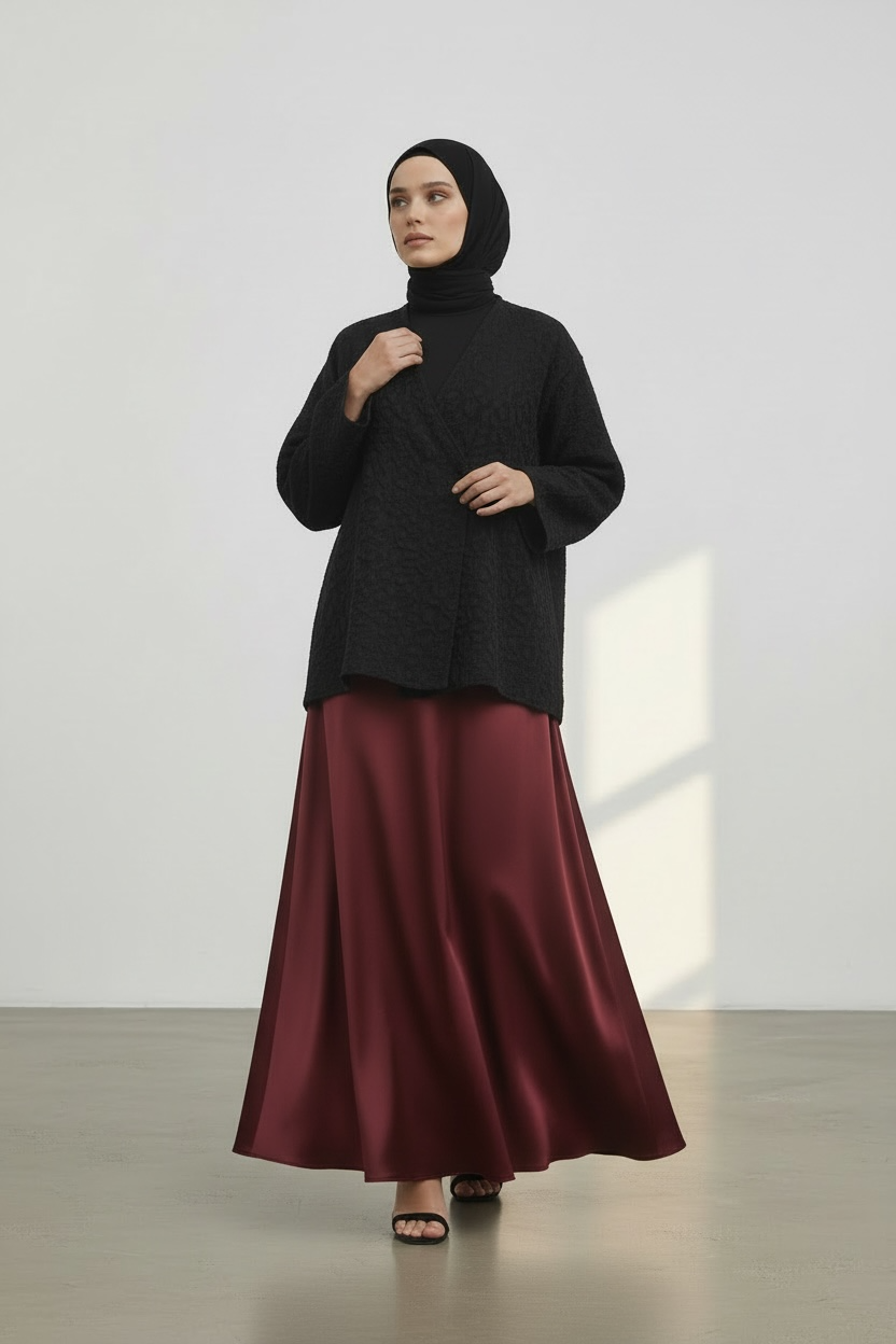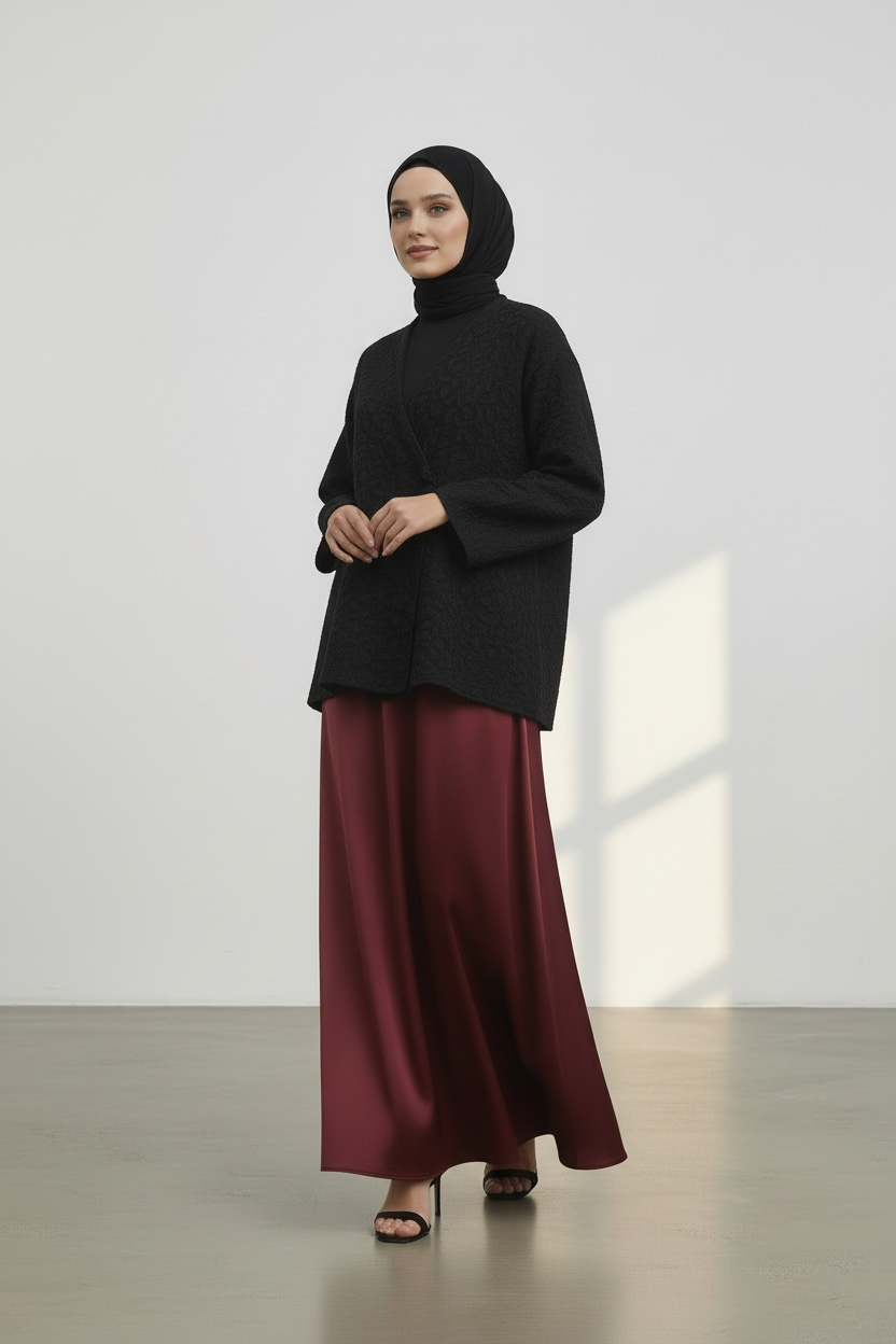 Dotée d’un col en V et d’une fermeture discrète sur le devant, elle se porte aussi bien ouverte que fermée, en superposition sur une robe, une jupe ou un pantalon. Les manches larges renforcent son style moderne et chic, idéal pour une tenue habillée comme pour un look plus minimaliste.