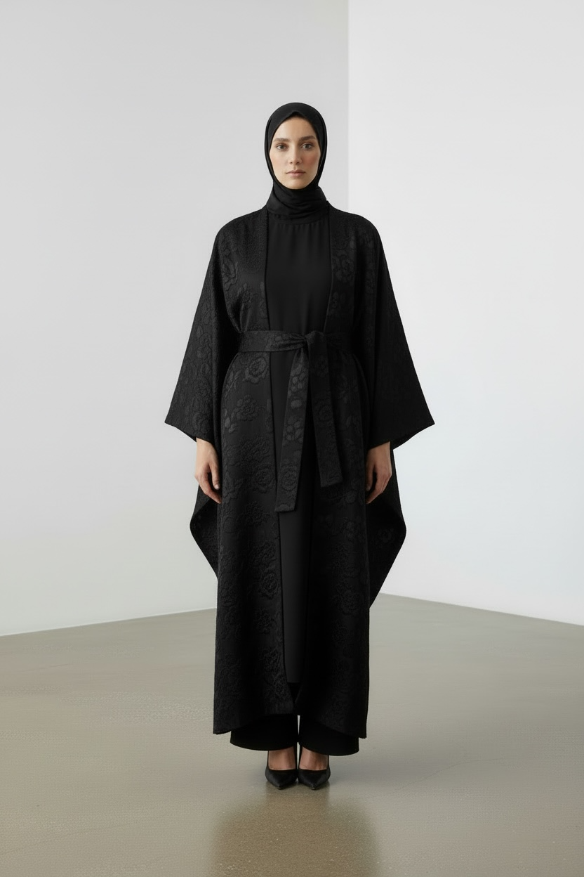 Ce kimono en brocard est une pièce forte au tombé majestueux. Sa matière subtilement texturée apporte profondeur et raffinement, tout en restant légère et agréable à porter. La coupe ample et droite permet un mouvement fluide et une silhouette élégante, idéale en superposition sur une abaya, une robe ou un ensemble minimaliste.