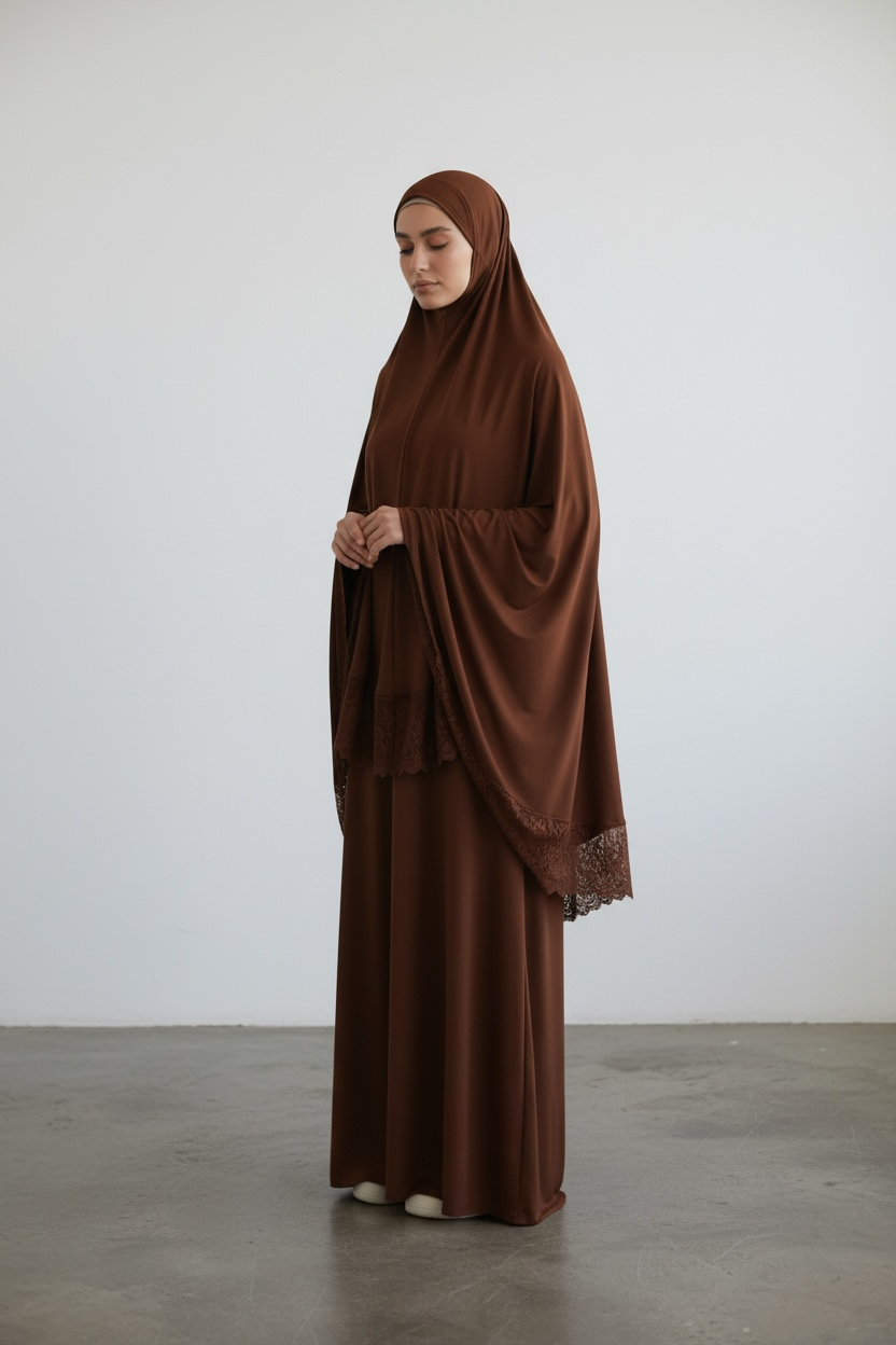 La coupe ample assure un tombé gracieux et un confort optimal pendant la prière. De délicates finitions en dentelle viennent sublimer les bords, apportant une touche raffinée et féminine tout en restant sobre et pudique.