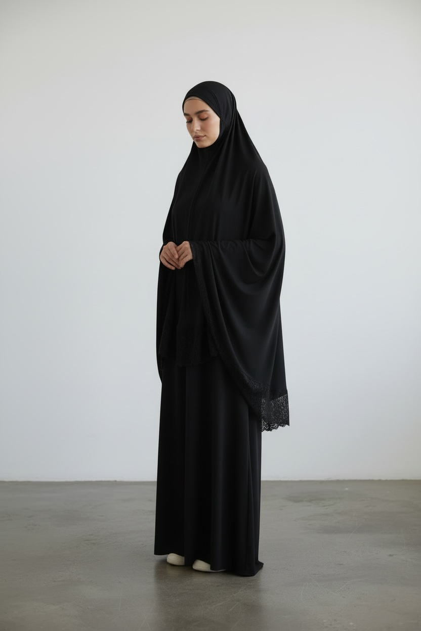 La coupe ample assure un tombé gracieux et un confort optimal pendant la prière. De délicates finitions en dentelle viennent sublimer les bords, apportant une touche raffinée et féminine tout en restant sobre et pudique.